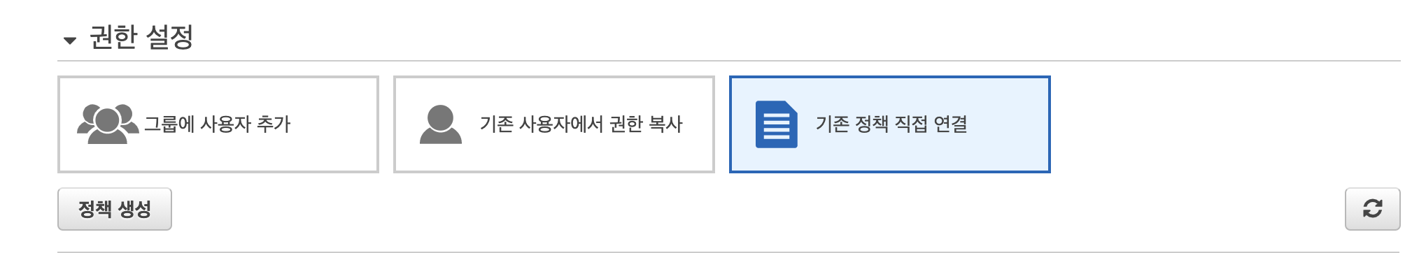그리고 다음을 누르면 사용자를 기존에 있던 그룹에 추가하거나 또는 권한 복사 또는 정책에 직접 연결해서 권한을 할당할 수 있다.
