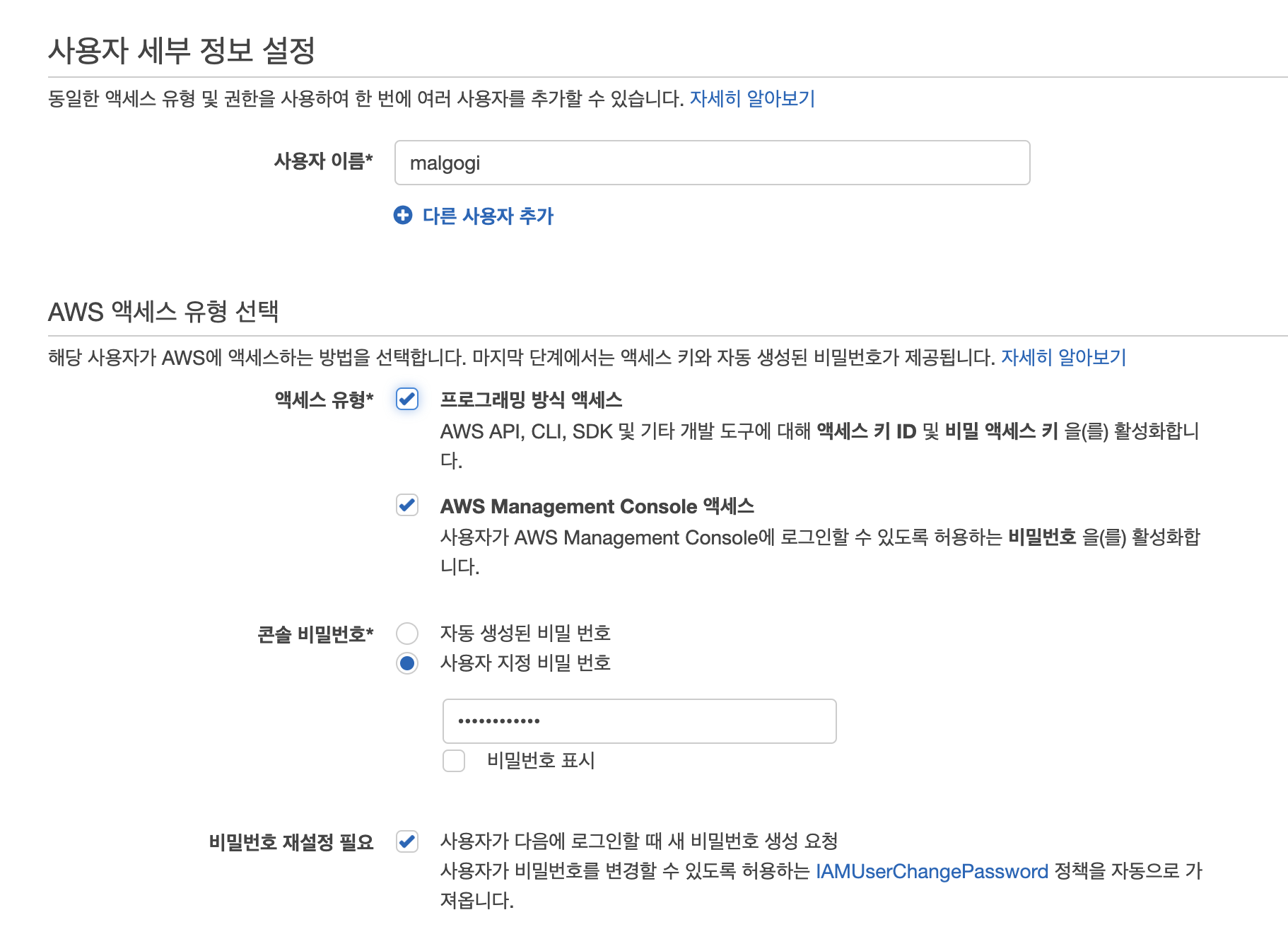 되도록이면 비밀번호 재설정을 키고, 다음 로그인시에 새 비밀번호를 생성하는 것이 좋다.